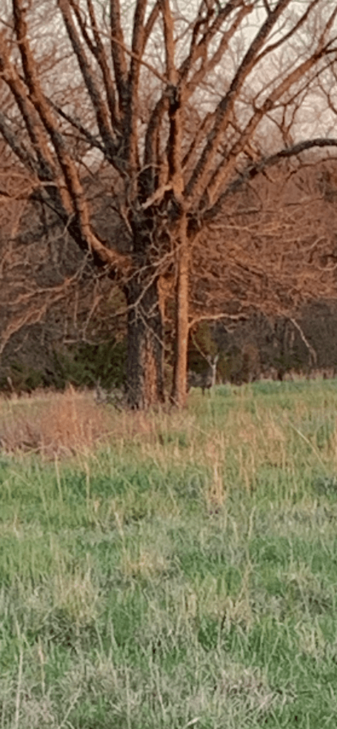Thus the walk… blue skies with light fluffy clouds and my prayer floats up too. “God everything seems to be just going on as normal. These are the same things I saw, the same sounds I heard a year ago this time on the walk I did back then. Nature has no idea the hardship and pain in our world right now. It just goes on.” Birds are preoccupied with singing and finding a worm here and there, and my deer friend: he’s concerned about whether a middle aged woman could be fast enough to bolt across a field and catch him so he’s going to keep an eye on me. All living in the moment. All taken care of by something much bigger than themselves, God.