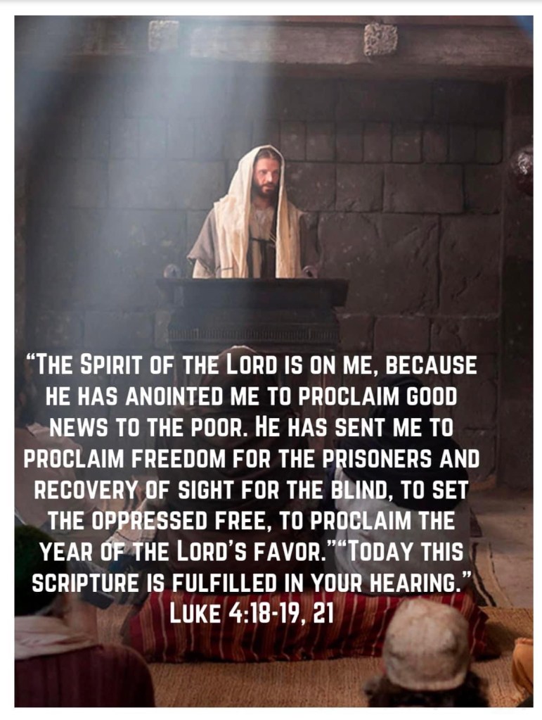 Jesus came to our world to “proclaim good news to the poor”-those who lack God’s riches in their life; “freedom for the prisoners” -caught in sin’s death, darkness, and destruction; “recovery of sight for the blind” -those who can’t see God’s goodness all around; “set the oppressed free”- those the enemy has beat up on all their lives. Jesus proclaimed “the year of the Lord’s favor.”